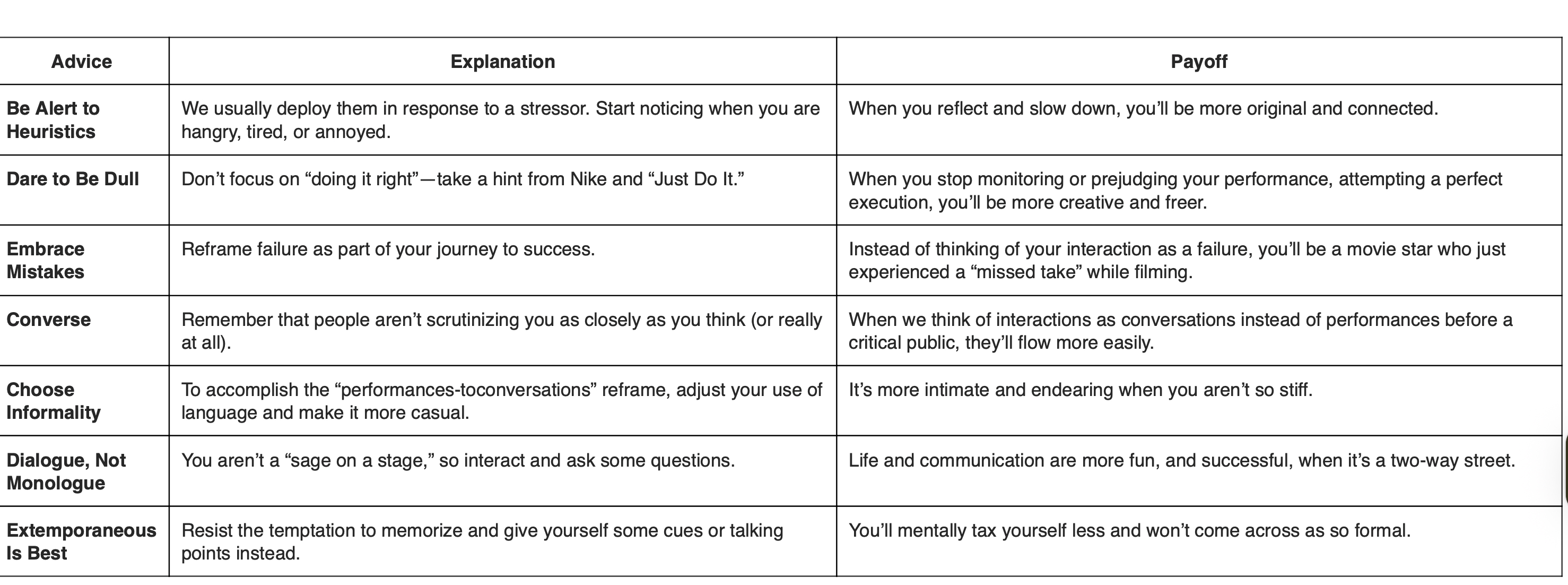 - Challenge: think of typical heuristics you often use when you communicate. Such as starting emails with “I hope you are well.” When you identify it, add an element of novelty that will break it.